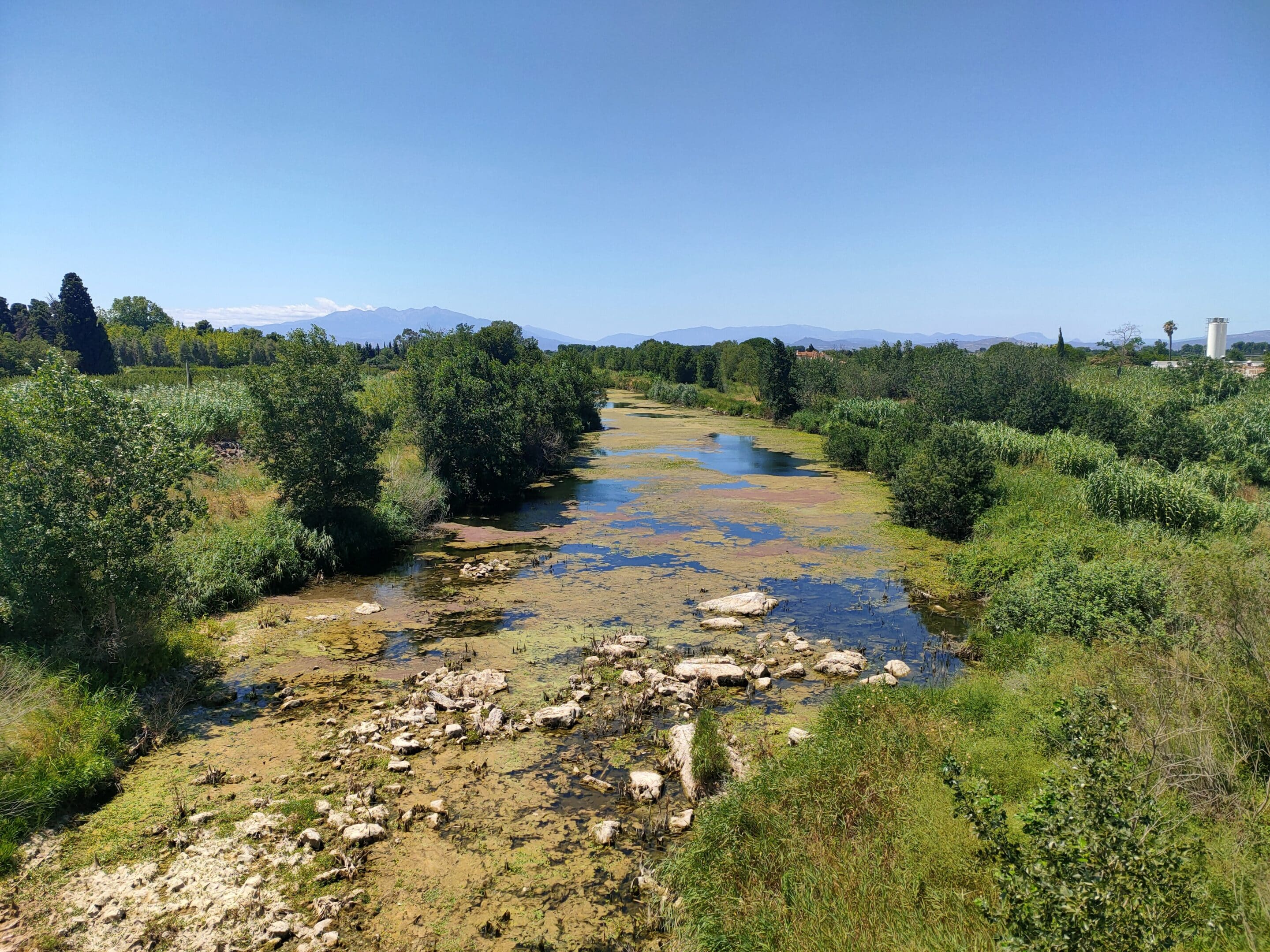 Depuis le 18 mai, le débit sortant du barrage de l’Agly est fixé à 1 800 l/s afin d’assurer le soutien à l’irrigation, tout en permettant de rester au-dessus du seuil de vigilance défini dans l’arrêté cadre sécheresse. À la station de mesure de l’Agly au Mas de Jau, un débit de 638 l/s a été enregistré, témoignant d’une situation plus favorable en 2025 qu’à la même période en 2023 et 2024. Lors de l’épisode orageux du 12 juillet, un pic de crue de 80 m³/s a été observé, suivi d’un retour progressif à un débit influencé par le barrage de l’Agly au bout de 4 à 5 jours. Lors de la dernière campagne, l’écoulement s’interrompait en amont de Claira, actuellement, un écoulement franc est visible au niveau du pont de la D11 à Saint-Laurent-de-la-Salanque.