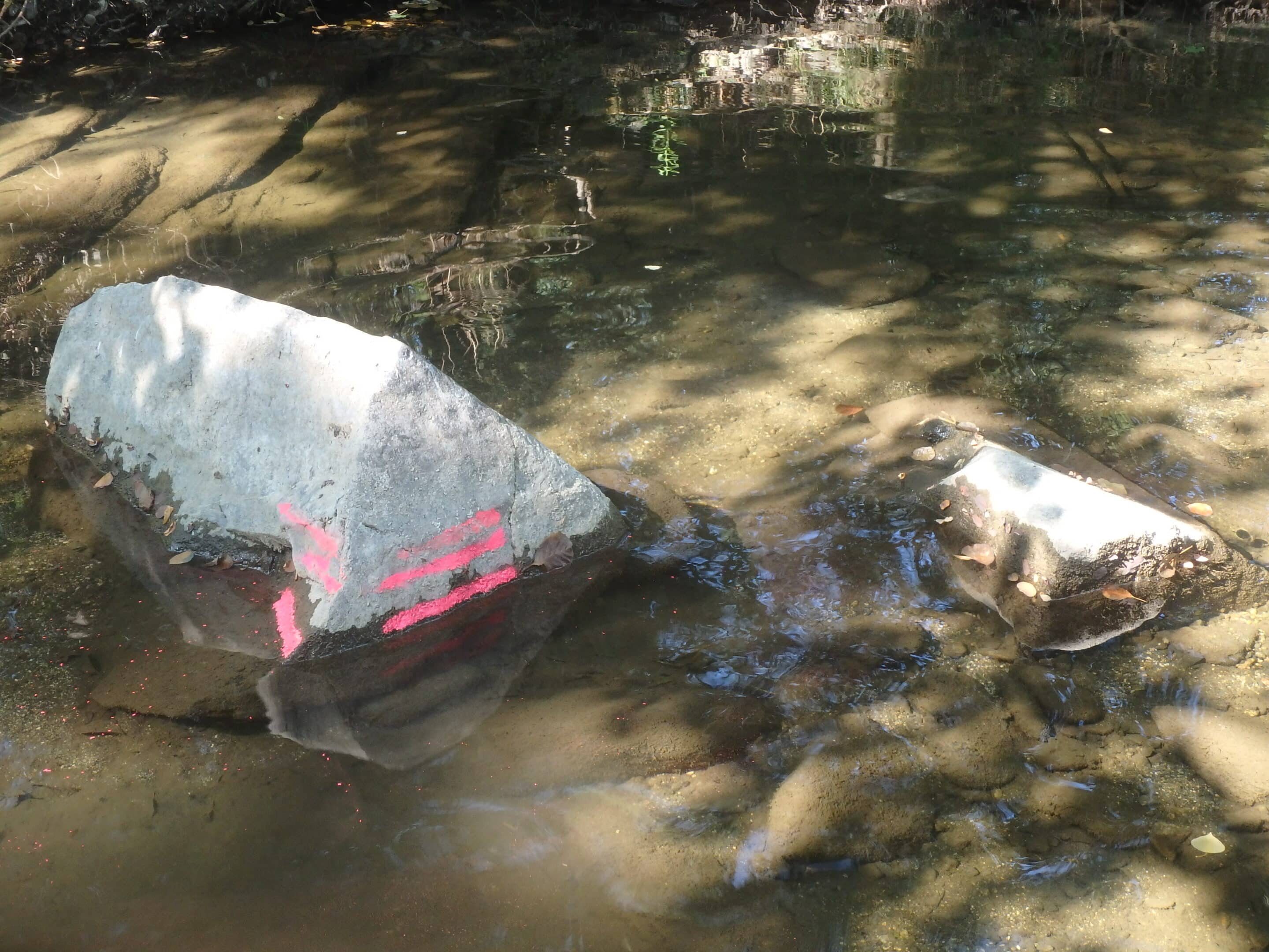 La situation de la Boulzane est en deçà des débits objectifs depuis le début de l’été, et cette situation dégradée perdure. Les débits mesurés présentent en effet de nouveau une forte diminution par rapport à la campagne précédente. Cette baisse est perceptible visuellement, avec notamment un agrandissement des zones de lit émergé en rive gauche (à droite sur la photographie d’ensemble du point B1 le 30 août), et une marque supplémentaire plus basse ajoutée à la bombe rose. Le faible niveau mesuré peut également être relié à l’agrandissement du lit émergé, et donc de possibles écoulements dans les sédiments sur ce tronçon.