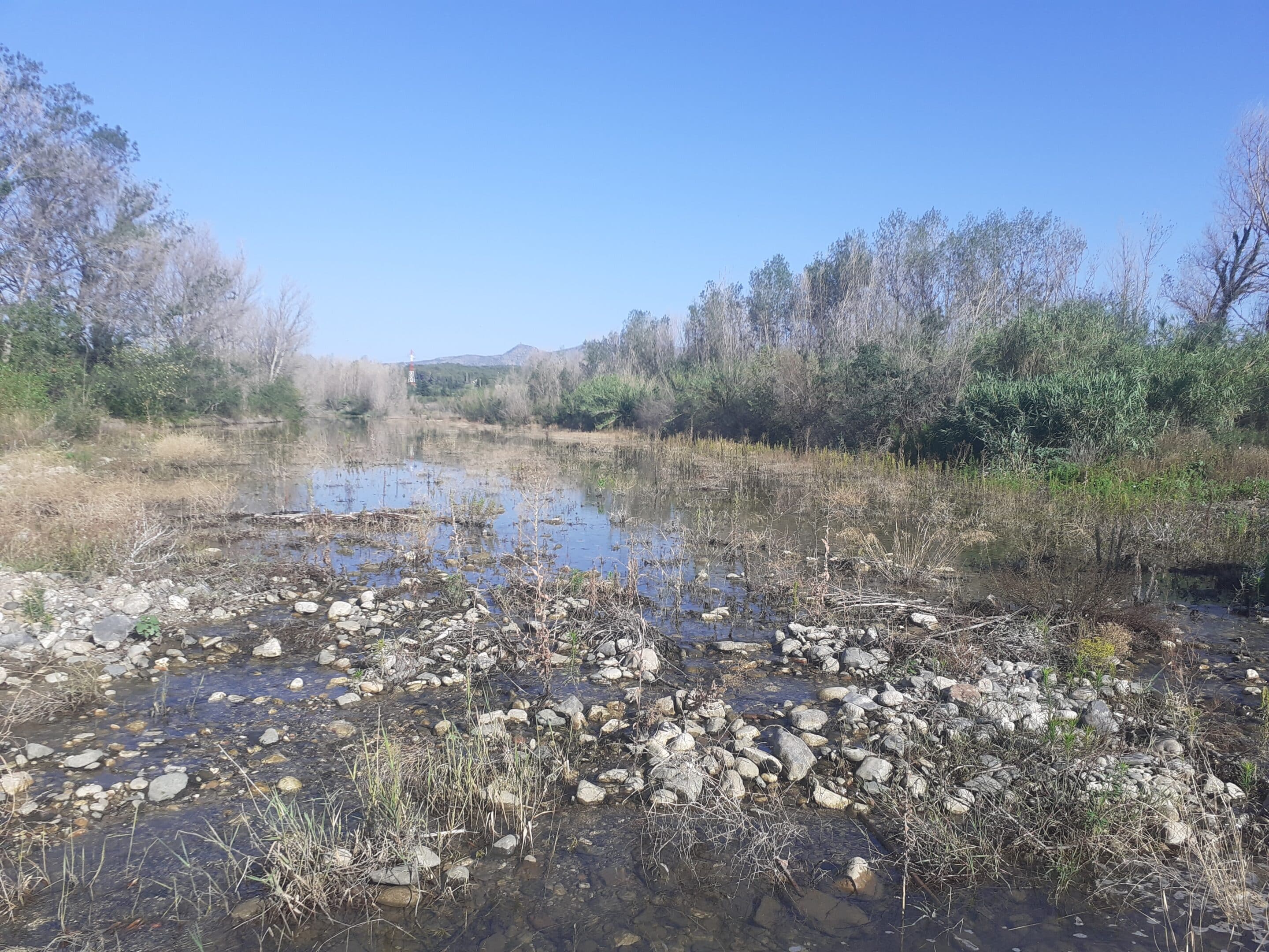 La fin de l’essai de recharges des forages et puits agricoles des secteurs aval d’Estagel a commencé le 8 juillet avec une baisse progressive du débit sortant à 1400 l/s et jusqu’à atteindre 800 l/s en fin d’après-midi le 09.07.24. Comme attendu, une baisse générale des débits est constatée jusqu’à Estagel, ainsi qu’un retour des zones d’assecs et de ruptures d’écoulement réapparaissent à l’aval d’Estagel jusqu’à la mer. Ces assèchements sont toutefois plus progressifs qu’attendus, traduisant la rehausse notable des nappes superficielles, au moins à proximité du cours d’eau. Des signes d’eutrophisation ou une accentuation de l’eutrophisation déjà présente ont pu être observés très rapidement après la baisse du débit de sortie de barrage sur certains secteurs (gué Estagel, gouffre de Jau, pont Espira).