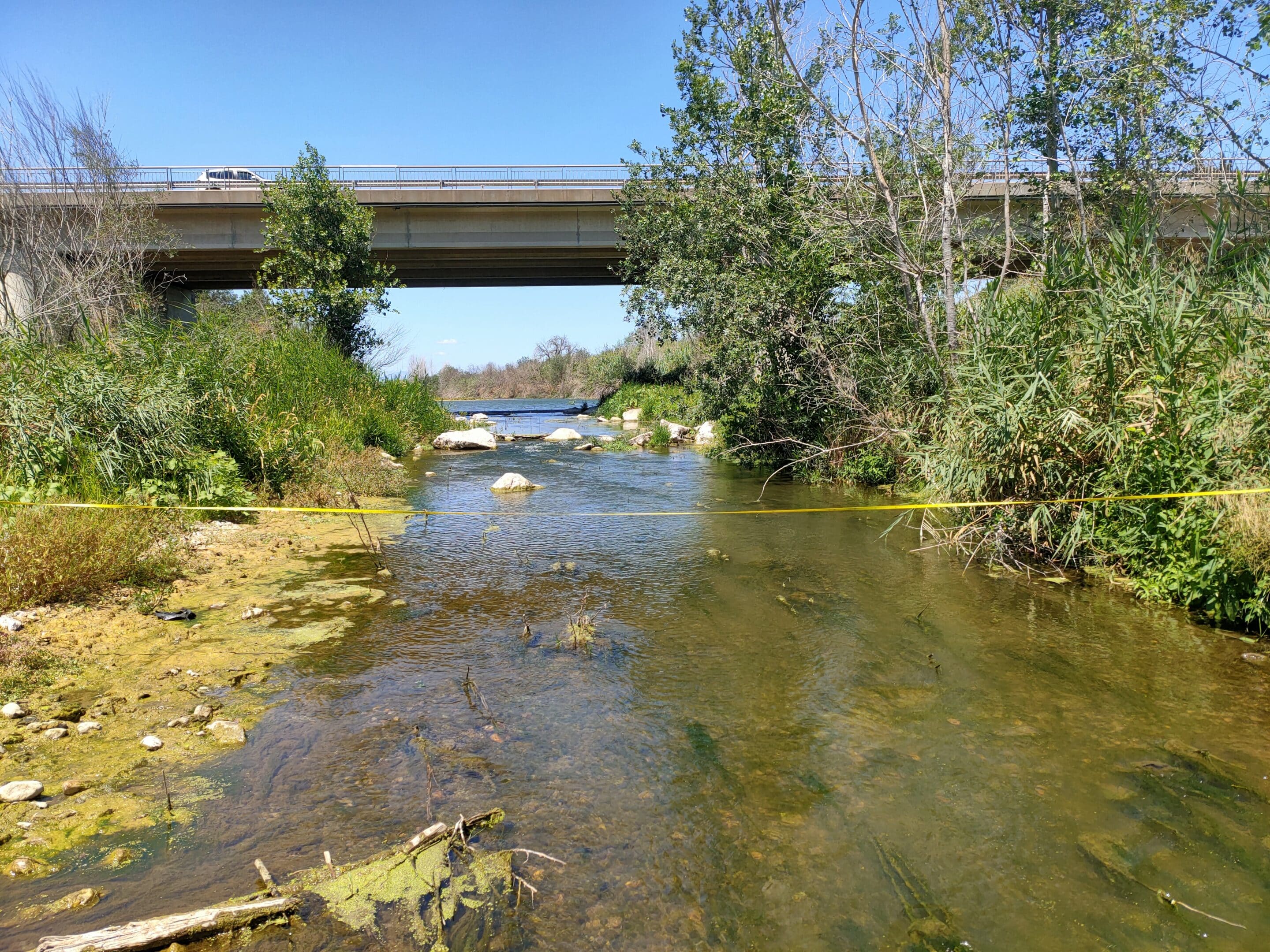 À la station hydro de la Clue de la Fou, la mesure du débit s’avère incohérente, avec une valeur de 0 l/s en raison de l’instabilité du seuil sur lequel est installé le capteur. Un jaugeage ponctuel a donc été réalisé par le SMBVA en aval de la station, permettant d’estimer le débit à 392 l/s. La situation apparaît ainsi nettement dégradée par rapport à la campagne précédente, où le débit était estimé à environ 650 l/s, malgré quelques incertitudes. Le débit mesuré est inférieur au seuil de crise fixé par l’arrêté cadre sécheresse (500 l/s entre le 1er et le 10 juillet pour la station de référence), mais demeure au-dessus du débit biologique, établi à 300 l/s en juillet pour le secteur de l’Agly amont jusqu’au barrage